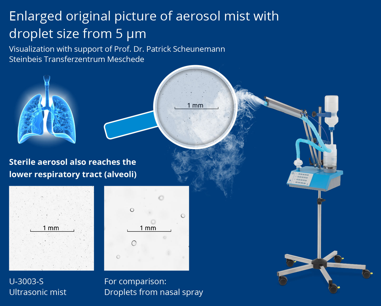 Les nébuliseurs à ultrasons traditionnels sont souvent contaminés par des germes et présentent un risque élevé d'infection. Les systèmes fermés d'eau stérile pour U-3003-S préviennent ce risque. L'eau stérile ou le médicament provient automatiquement de récipients jetables ou de systèmes de suivi conçus sur mesure. Manipulation simple et conviviale avec enregistrement automatique des dernières valeurs de réglage utilisées ainsi que réglage de la durée.